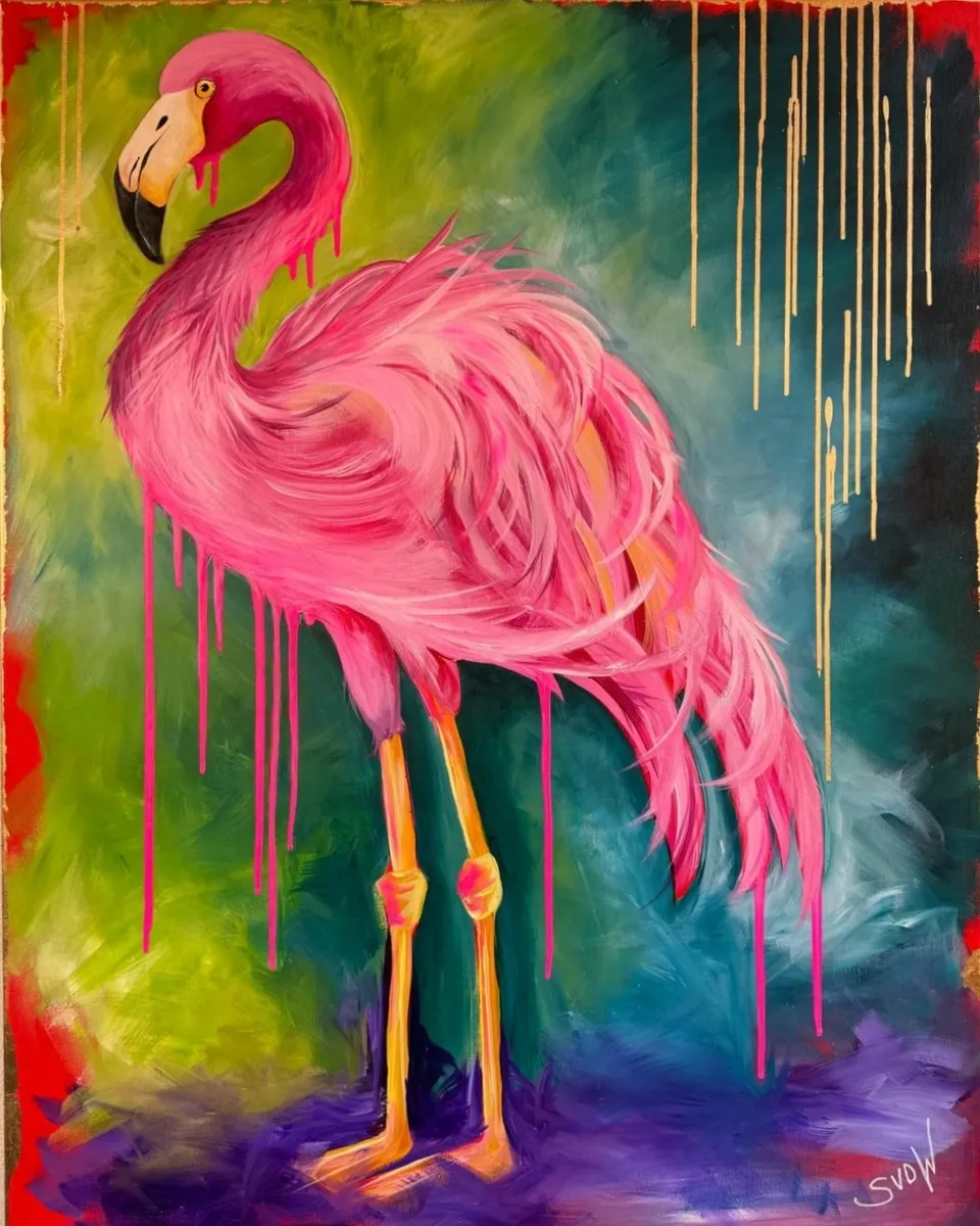Flamingos are one of my favourite subject matters to paint. They're elegant, yet come across with such sass. The colour palette used in this painting gives off a very 80's vibe.