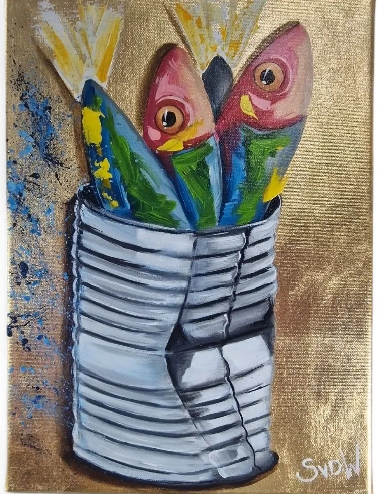 This whimsical artwork presents a playful scene where vibrant fish emerge from a metallic can, embodying creativity and joy. The bold colors of the fish contrast beautifully with the shimmering gold background, creating a striking visual impact. Each detail, from the expressive eyes to the lively hues, invites a sense of wonder and imagination.