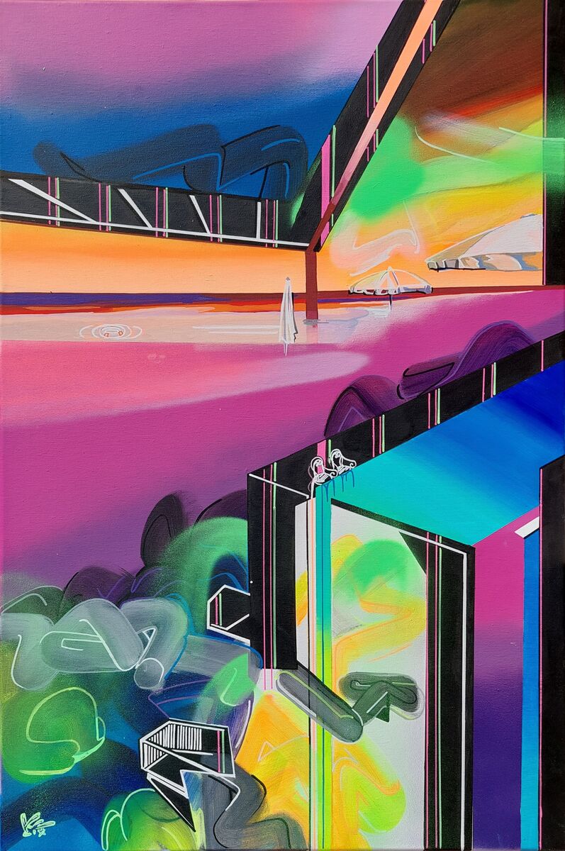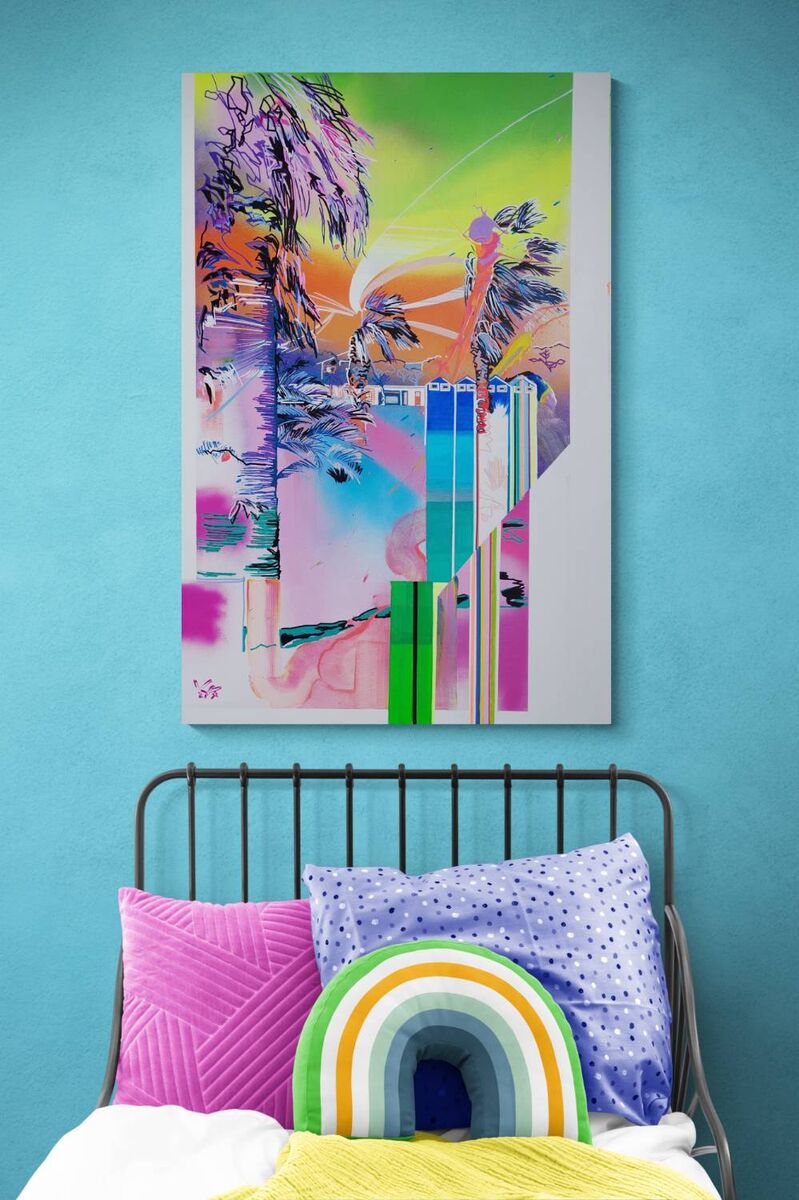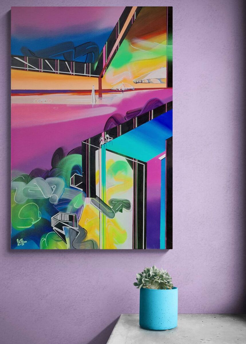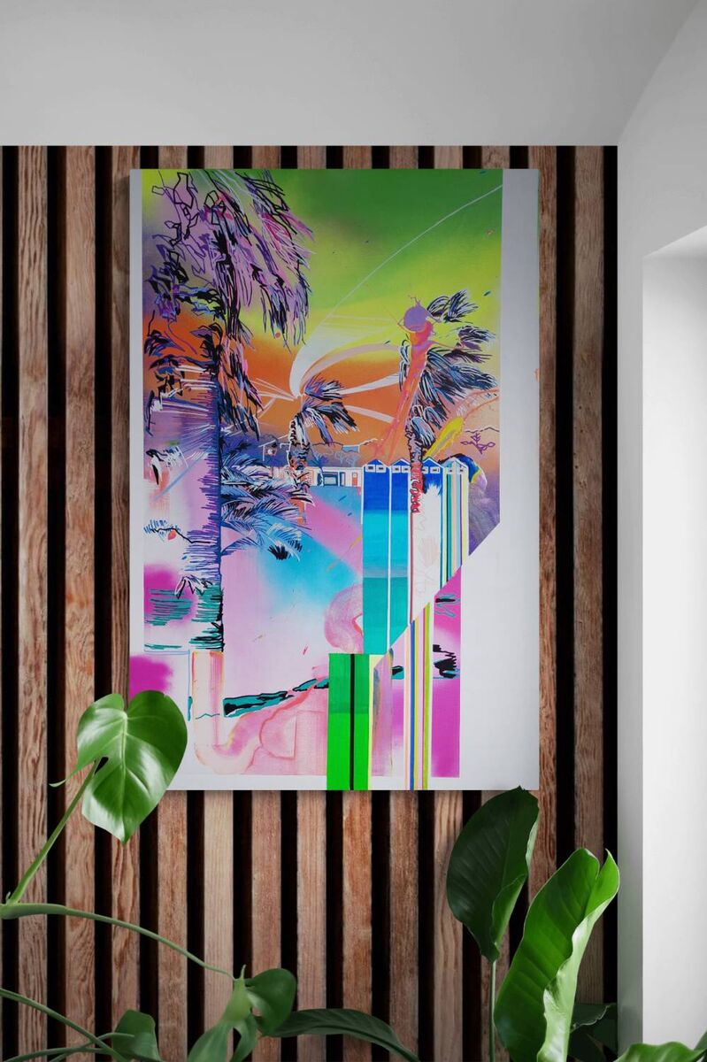 Do you love picturesque beach huts or looking for coastal wall art? Colorful painting, inspired by the beautiful beach of Poetto, Sardinia, with bright and vibrant composition, created using spray paints and acrylic paints, and markers. This painting has many layers and eye-catching details, with a pop of glitch and solarpunk style. The color palette is bright and vivid, tropical and optimistic.