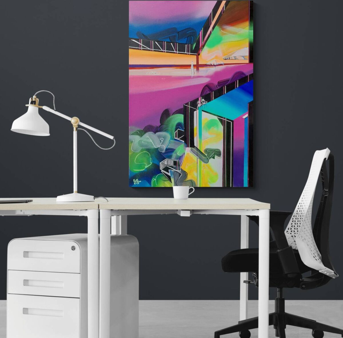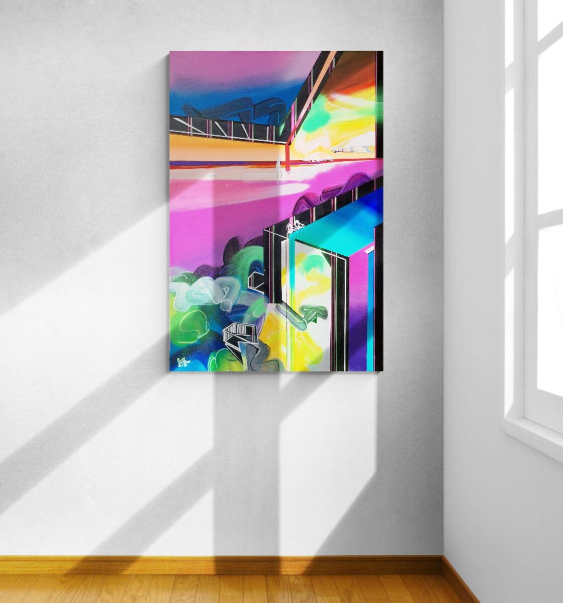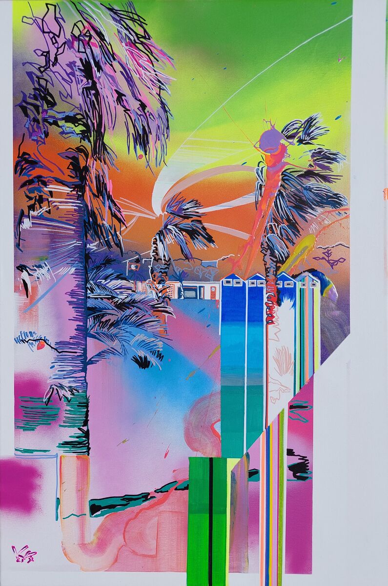 Do you love picturesque beach huts or looking for coastal wall art? Colorful painting, inspired by the beautiful beach of Poetto, Sardinia, with bright and vibrant composition, created using spray paints and acrylic paints, and markers. This painting has many layers and eye-catching details, with a pop of glitch and solarpunk style. The color palette is bright and vivid, tropical and optimistic.