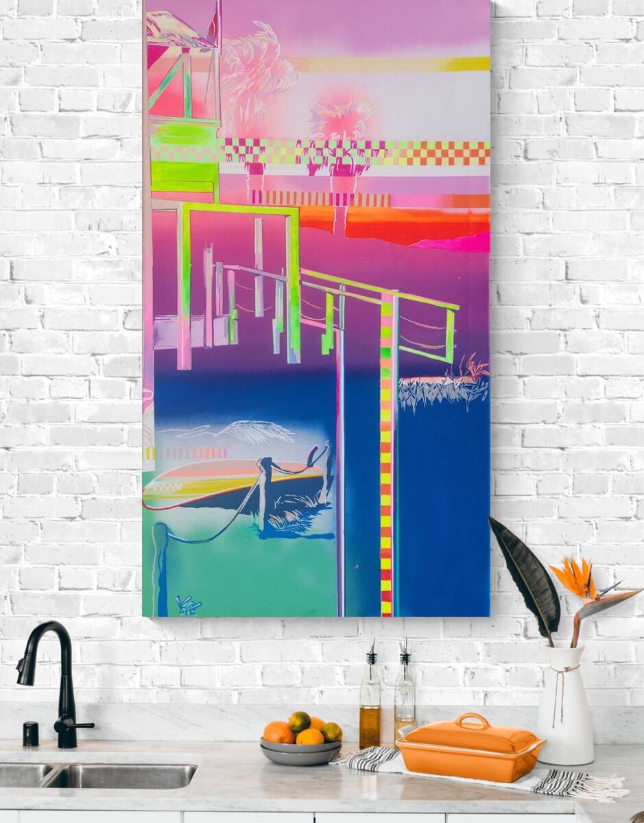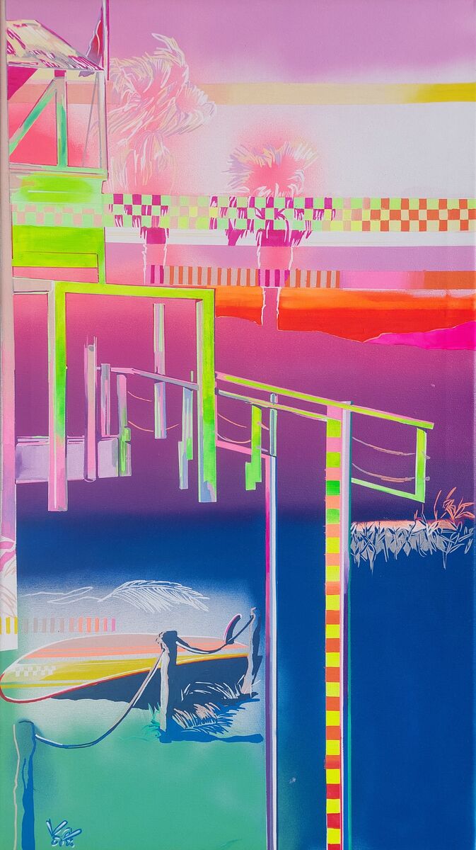Lifeguard tower painting in vaporwave art style and a touch of retro, inspired by dreamy, tropical sunset atmosphere! Bold and vibrant color palette with a pop of neon colors, eye-catching hand-drawn details of surf laying on the sand, palm trees, and glitch features. Good vibe wall art for summer lovers! Used neon paints glow in blue light.