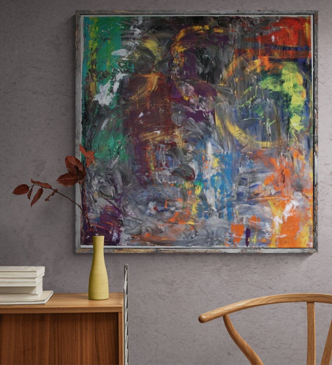 A 3'x 3' acrylic painting on canvas for sale by artist. This piece is heavily textured with modling paste applied with palette knives and drywall tools. Oil pastel accents applied with my fingers. #6 in the Chubby Rain series. Local Los Angeles pickup. Shipping not included