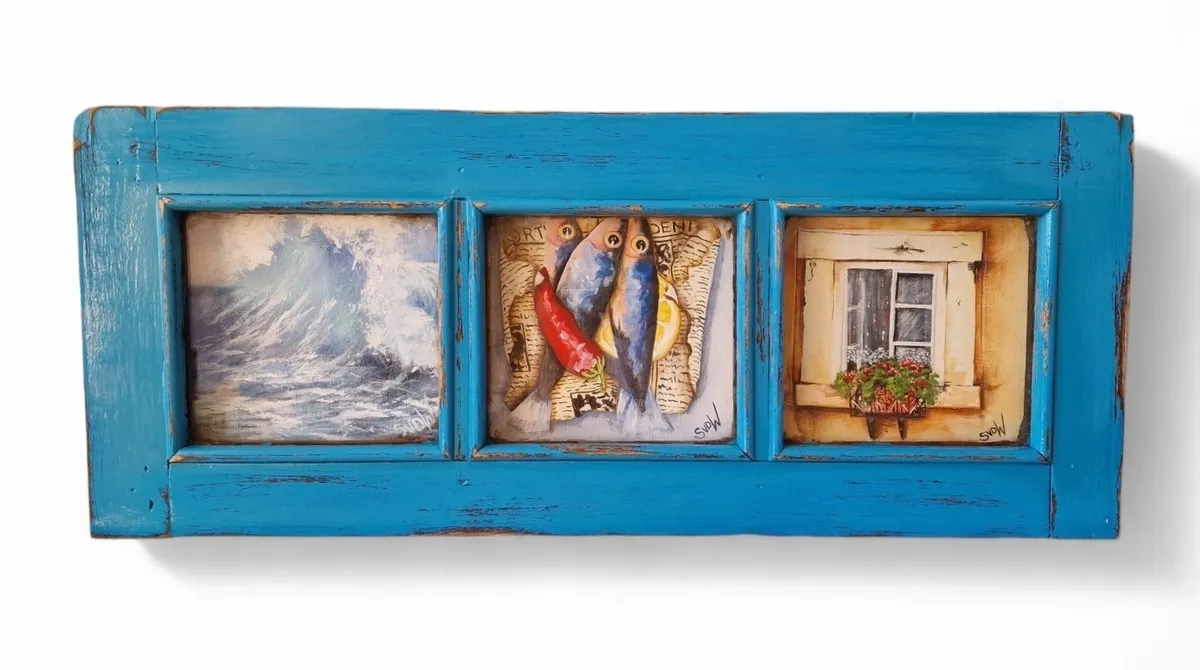 Framed within a weathered, sea-blue wooden window, this triptych invites the viewer on a journey through coastal life. Each panel offers a vignette, together weaving a story of the sea, its bounty, and the homes it sustains. The Wave – A powerful surge of ocean spray, rendered in soft yet dynamic tones of blue and white, capturing both the strength and poetry of the sea. The Catch – Three sardines, glistening with realism, rest against crinkled newspaper alongside a red chili pepper and lemon slice — a nod to traditional seaside markets and the timeless rituals of preparing the day’s catch. The Window – A rustic cottage window framed in warm hues of ochre, lace curtains gently drawn, and a flower box blooming with vibrant geraniums. A glimpse into the charm of everyday life by the shore. The distressed turquoise frame unifies these scenes, its texture echoing driftwood weathered by salt and sun. Together, the three images form a lyrical celebration of coastal heritage, evoking nostalgia, tradition, and the intimate beauty of seaside living.