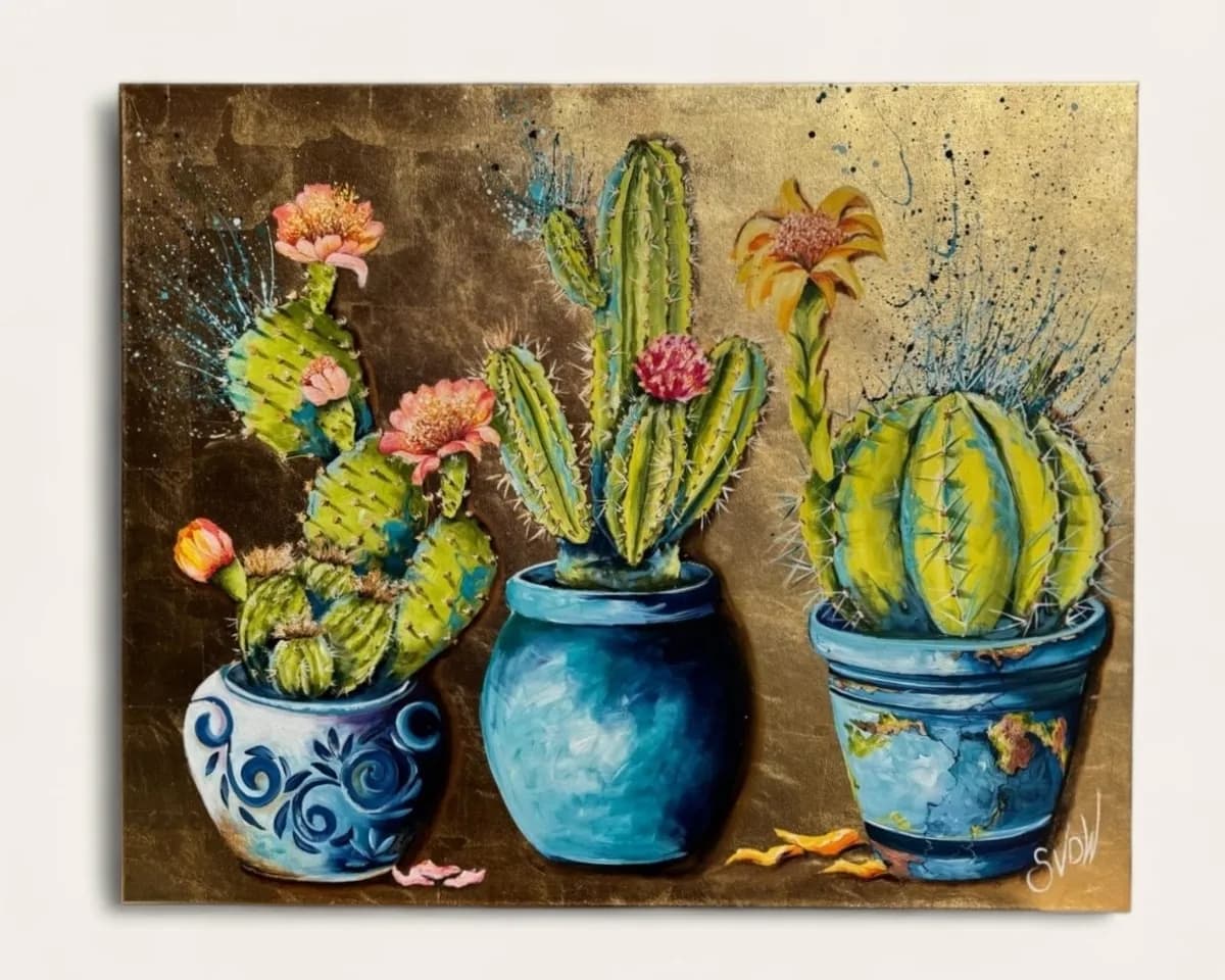 Golden Bloom Trio 100 x 80 x 5cm Acrylic Gold leaf Bathed in the warmth of gold, Golden Bloom Trio is a celebration of endurance and radiance. Three cacti rise like desert muses, their blossoms unfurling in defiance of arid silence. Each vessel of deep blue holds its own spirit — a harmony of resilience and grace. The interplay of luminous gold leaf and bold acrylics invites the eye to wander between stillness and vitality, shadow and bloom. This piece whispers of sunlit horizons, quiet strength, and the beauty that thrives where few would dare to grow. I’ve always been drawn to the quiet resilience of cacti — how they bloom fiercely in places that seem barren, how their thorns protect the tenderness within. In this painting, I wanted to honor that contrast: fragility wrapped in strength, beauty born from endurance. The gold leaf represents the sun that sustains them, but also the sense of admiration I feel for nature’s small miracles. Each brushstroke became a meditation on growth, patience, and the light that persists even in the harshest landscapes. https://www.samanthavanderwesthuizen.art/ #samanthavanderwesthuizen #svdw #artist #acrylicartist #acrylicart #localartist