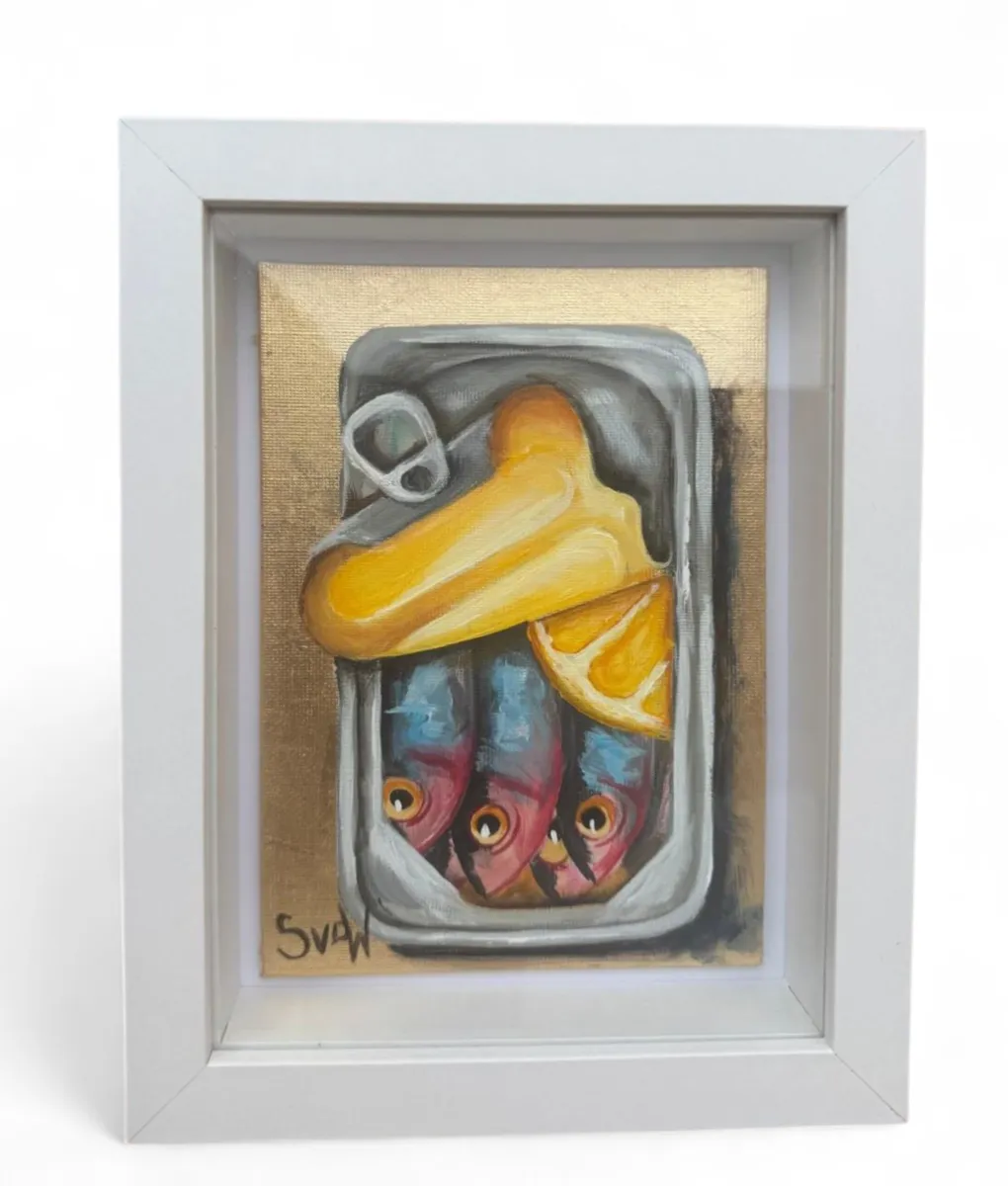 A striking small-scale painting executed in acrylic on a gold leaf base. This piece presents a hyper-focused still life of vibrant sardines neatly packed in a partially opened tin, featuring a large, stylized pull-tab and a wedge of citrus, all shimmering against the gilded background.