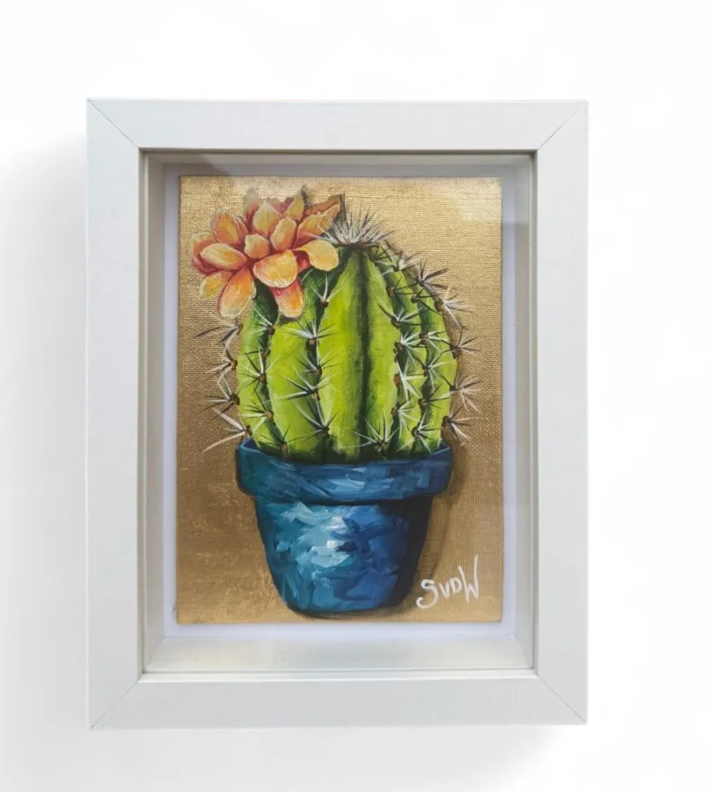 A vibrant and graphic miniature painting created using acrylic on a shimmering gold leaf base. This piece features a beautifully rendered green barrel cactus, its prominent spines highlighted against the warm background. The cactus is planted in a bold, cobalt blue pot and is topped with an impressive orange bloom, celebrating the surprising beauty and resilience of desert flora.