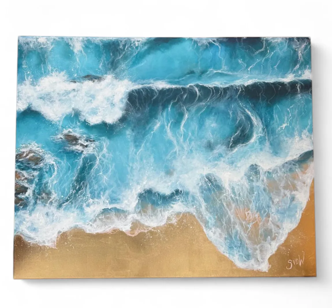 An immersive, top-down perspective capturing the raw power and beauty of the ocean meeting the coast. This piece is created using acrylic medium to render the translucent, swirling depth of the turquoise water and the white, frothy sea spray. The bottom half of the canvas is overlaid with gold leaf, which serves as a luminous, metallic sand, creating a dramatic contrast between the cool ocean blues and the warm gilded beach.