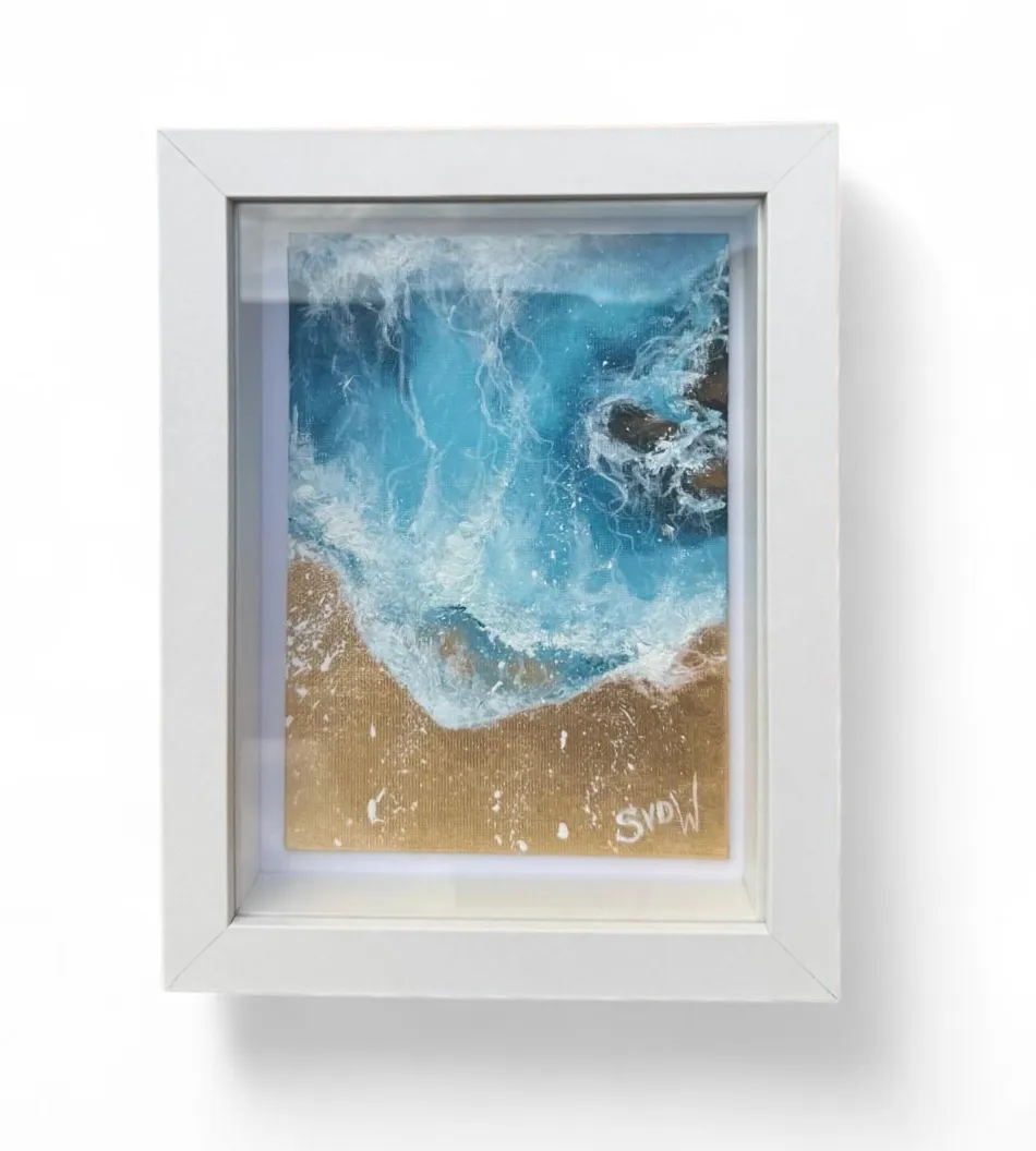 A captivating miniature that draws the eye into the powerful currents of the sea. The artist uses layered acrylics to create the stunning depth of the clear blue water, which swirls around dark, submerged rocks. The bottom third is rendered in brilliant gold leaf, serving as the shining beach. The dynamic white foam is applied thickly, creating beautiful texture and a scattering of white spray that connects the ocean and the gilded shore.