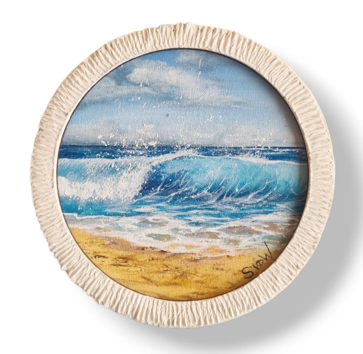 Where the sea breathes.... Acrylic Skimboard 75 x 44cm This is a hand-painted skimboard. Not a board for riding, but a surface for storytelling. I wanted to capture that suspended moment when the ocean inhales, just before the wave breaks and everything shifts. Movement, breath, and memory held still for a second. A painting shaped by the sea itself.